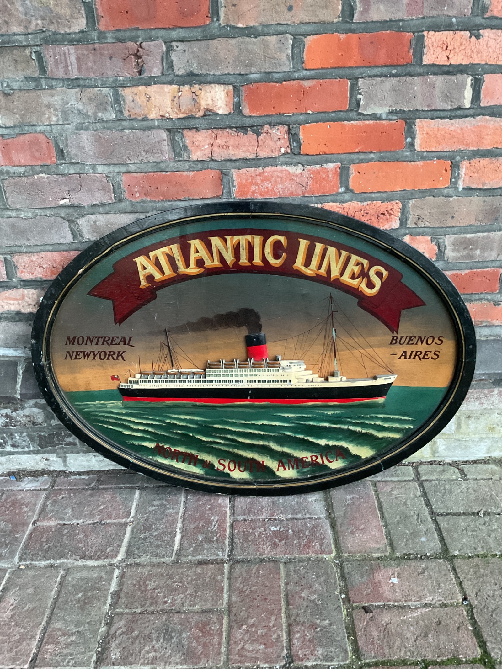 This striking sign depicts the route of the Atlantic Lines steamships, connecting Montreal, New York, and Buenos Aires. Crafted from wood, the sign features a detailed illustration of a steamship, evoking the golden age of ocean travel. The bold lettering and vibrant colours make this a visually appealing piece of nautical history, likely used for advertising or display purposes.