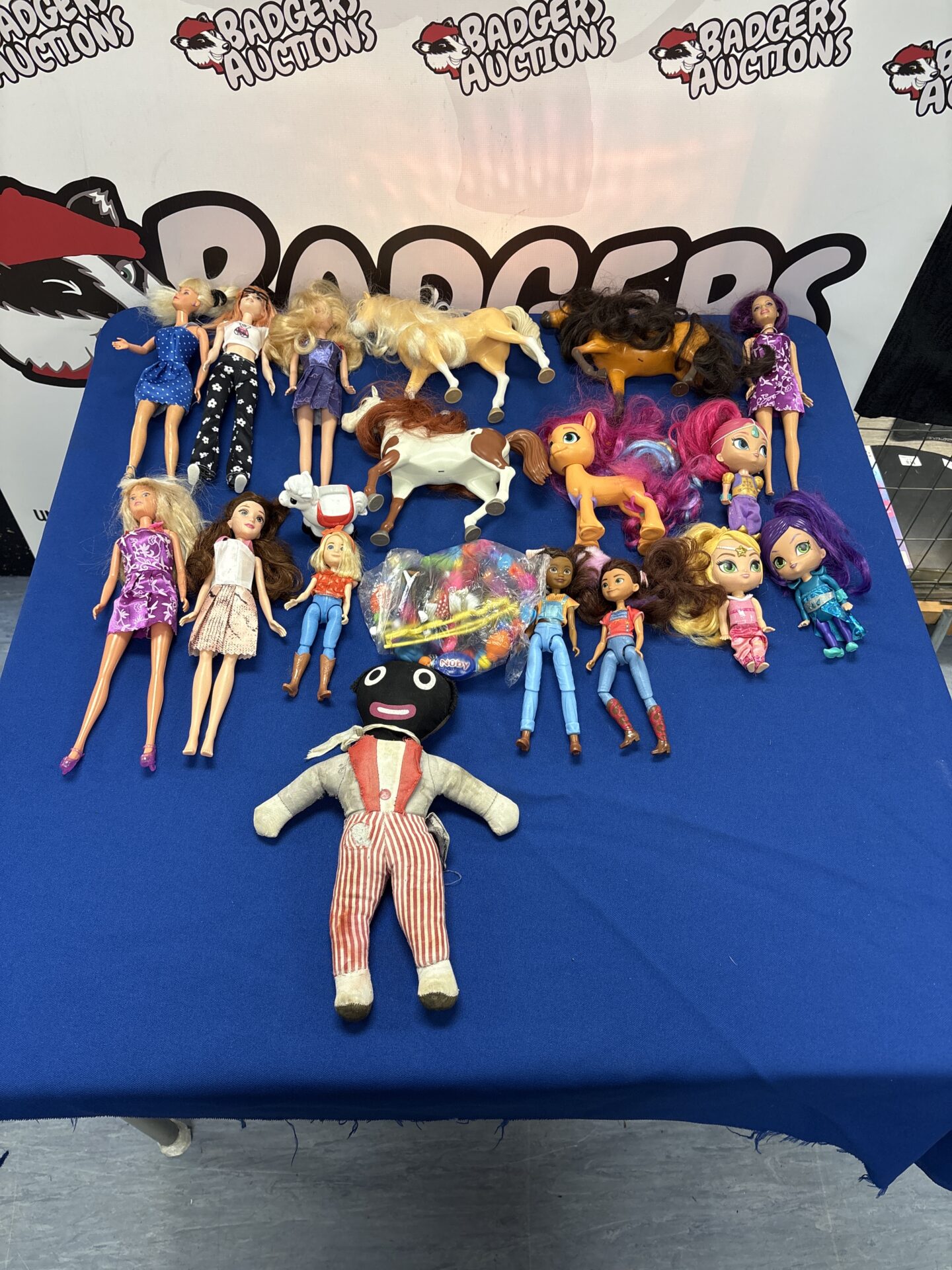This lot features a collection of Mattel Barbie dolls, accompanied by several horse figurines. The dolls showcase a variety of outfits and hairstyles, typical of the Barbie range. Included within the lot is an antique golly doll, adding a unique and vintage element to the collection.
