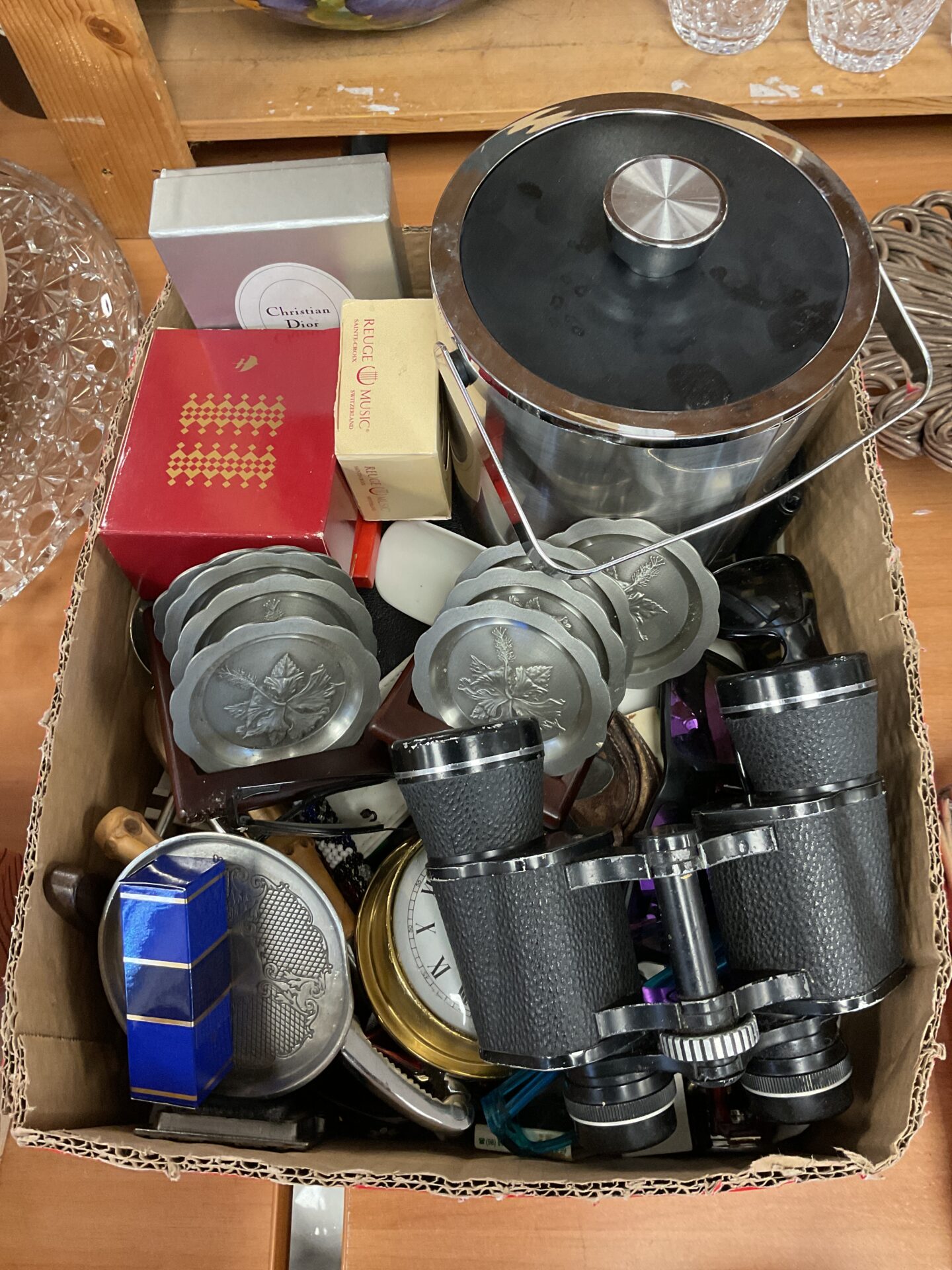 This mixed lot comprises a variety of vintage and collectible items. Included is a stainless steel ice bucket, a pair of binoculars, and a selection of pewter dishes. The lot offers a diverse range of items suitable for collectors or those seeking unique home decor pieces.