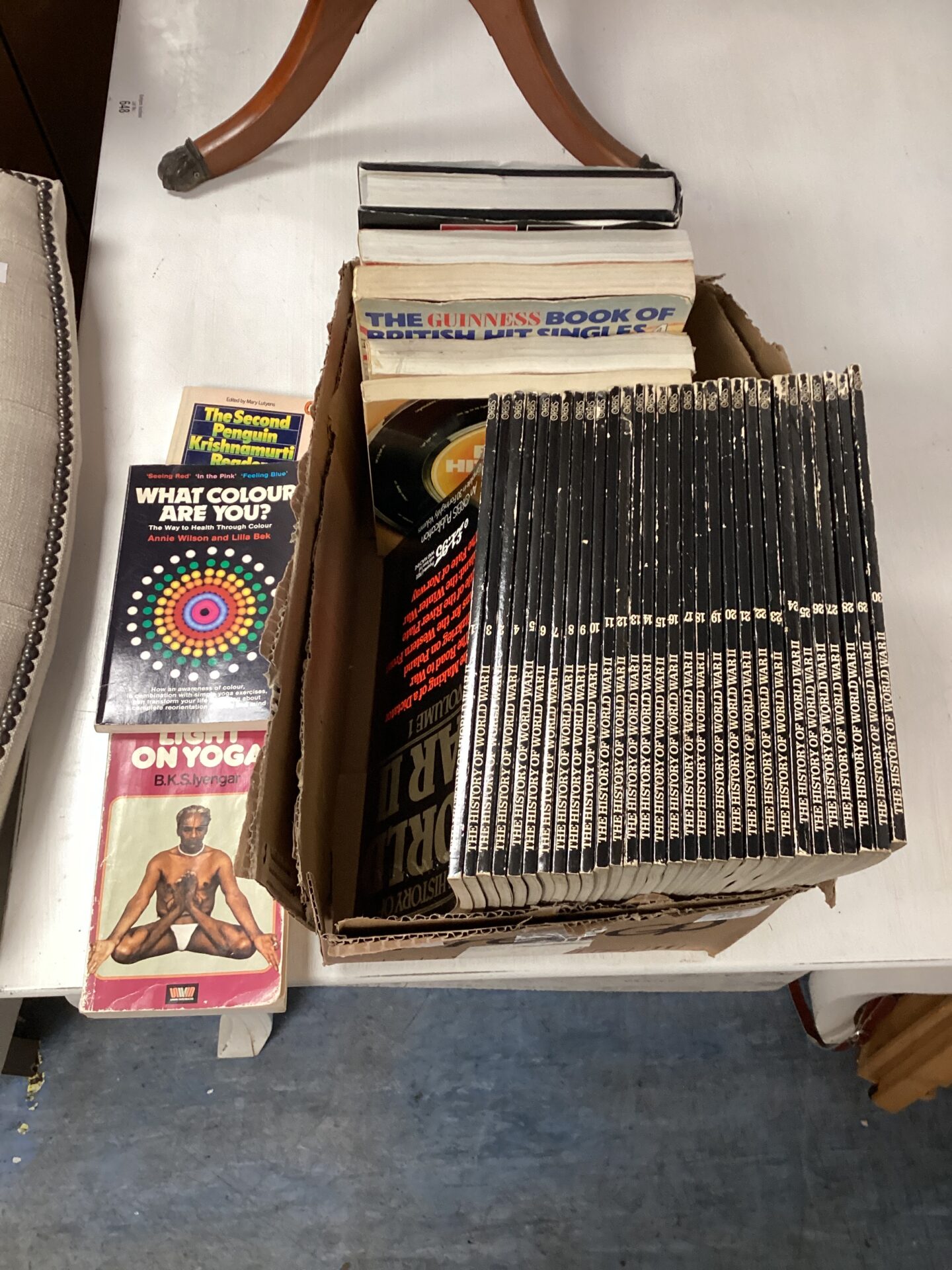 This lot comprises a selection of books, including a history of World War II and a copy of *The Guinness Book of British Hit Singles*. The collection offers a diverse range of reading material, spanning historical accounts and popular music references. The books appear to be primarily paperback editions, suggesting a focus on accessible reading.