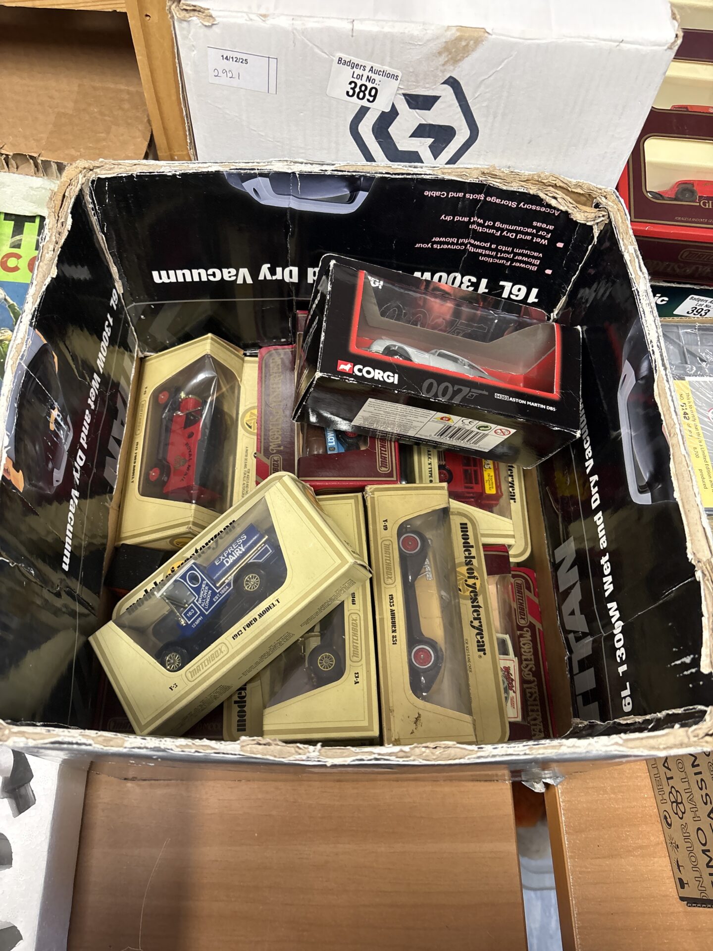 This lot comprises a collection of boxed diecast models, including examples from Corgi and Matchbox. The selection appears to feature a variety of scales and vehicle types, offering a diverse range for collectors. The boxes show varying degrees of wear, consistent with age and storage.