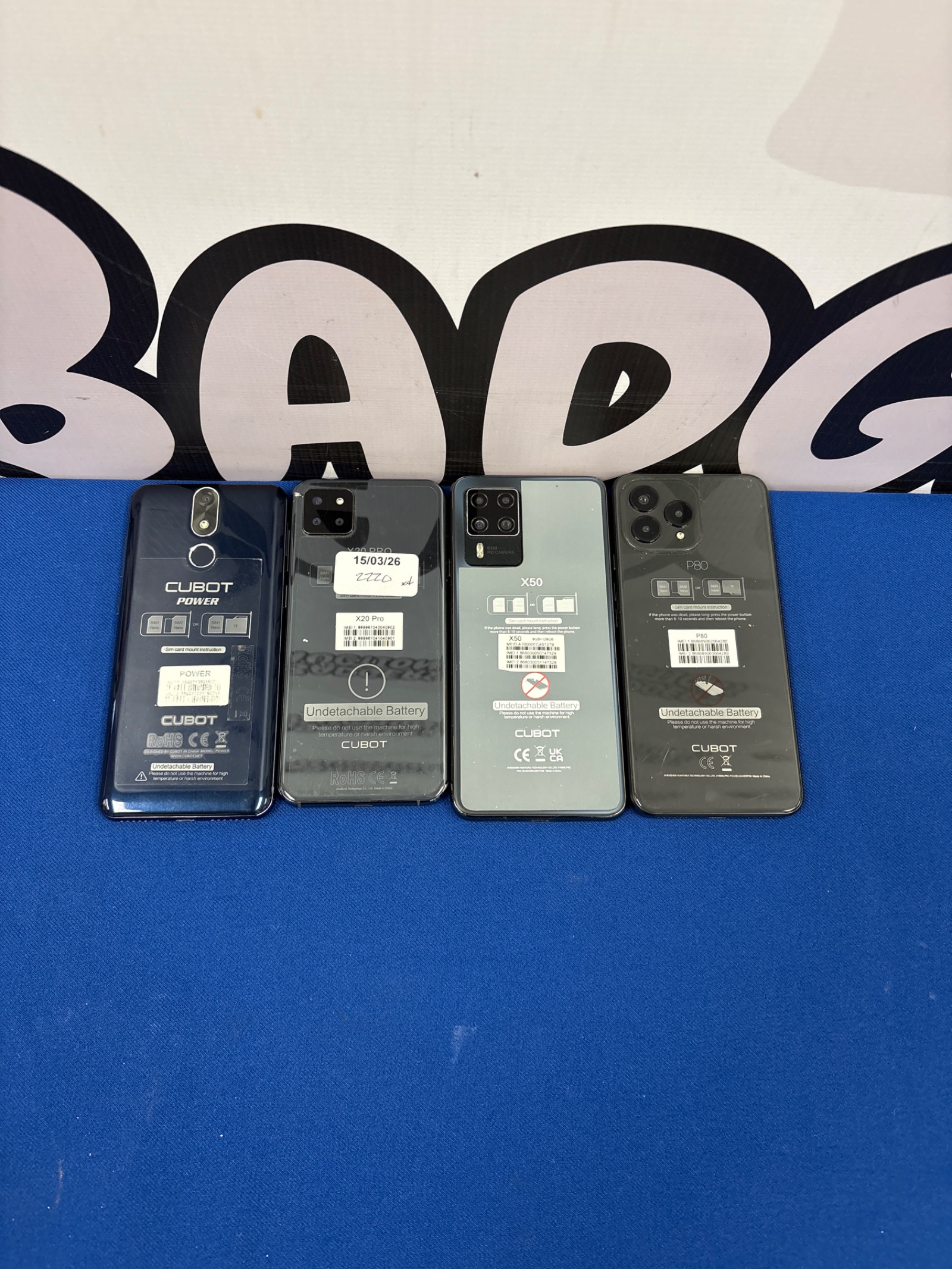This lot comprises four Cubot branded mobile phones. The models included are the Power, Z30 Pro, X50, and P30. Each phone features a distinct design, with varying camera configurations and screen sizes, typical of smartphones from this manufacturer.