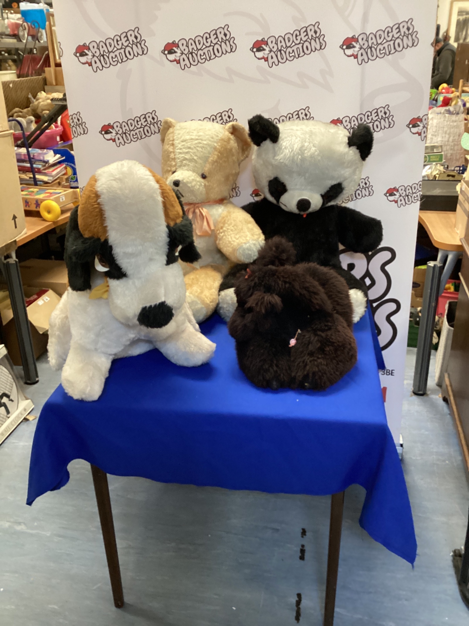 This lot comprises four large, soft cuddly toys. There are two teddy bears and two dog figures, all constructed from plush materials. The toys appear to be well-loved and offer a comforting, tactile experience. Their size makes them ideal for snuggling or as decorative pieces.