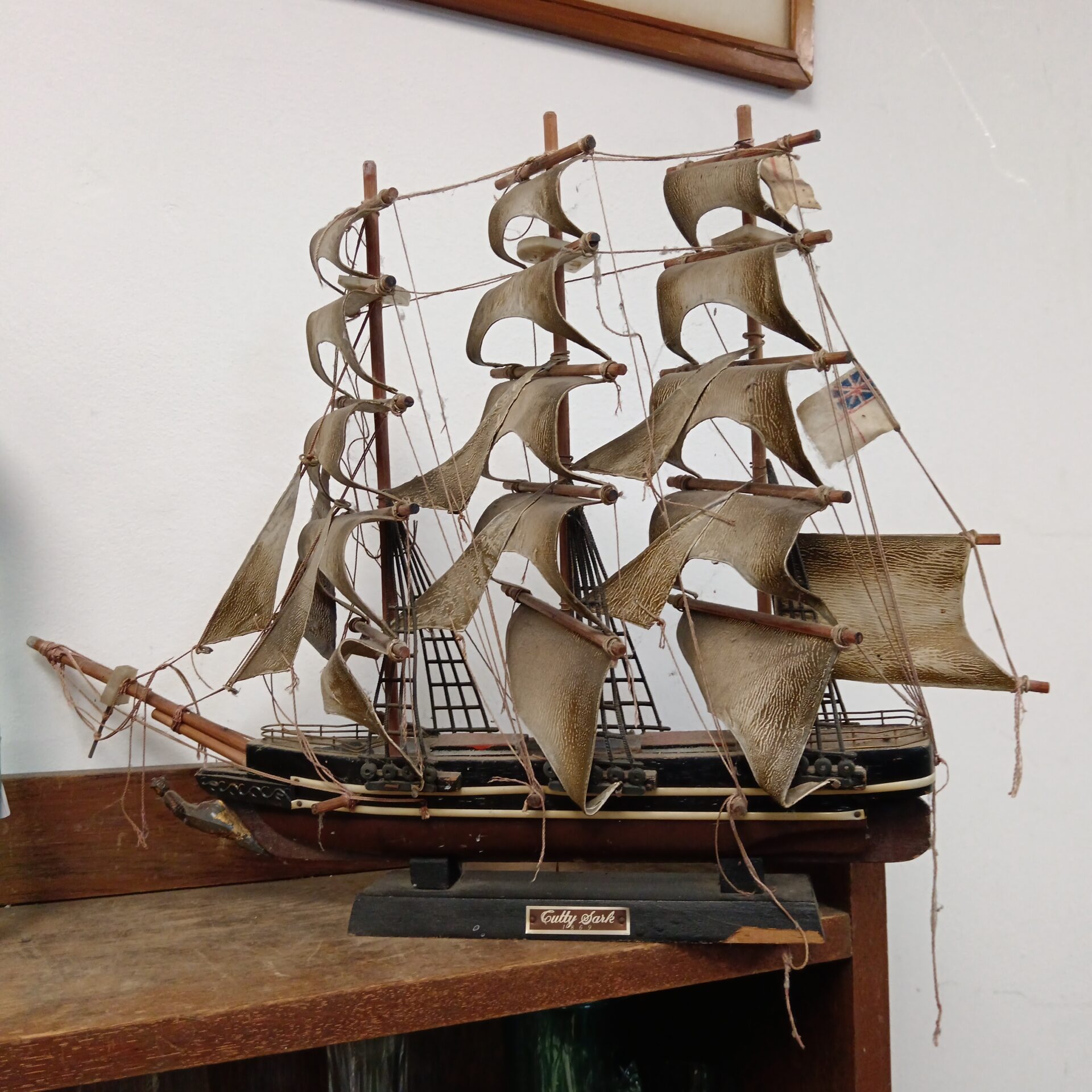 This is a detailed, hand-built model of the famous clipper ship, the Cutty Sark. Constructed from wood, this model showcases the ship’s intricate rigging and hull design. The model features a detailed deck and masts, capturing the essence of this historic vessel. It is a beautiful representation of maritime history and craftsmanship.