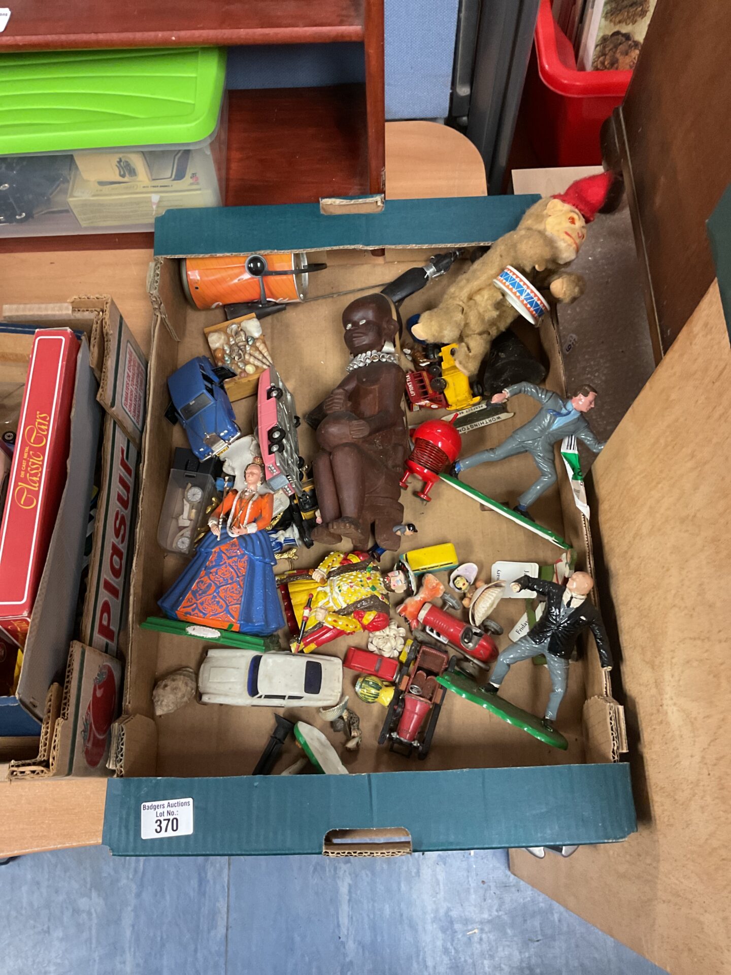 This mixed lot features a collection of vintage toys, prominently including several Dinky Toys die-cast cars. Alongside these are other assorted toys, notably a charming drumming monkey, adding a playful element to the collection. The lot represents a nostalgic glimpse into classic toy manufacturing and design, appealing to collectors and enthusiasts alike.