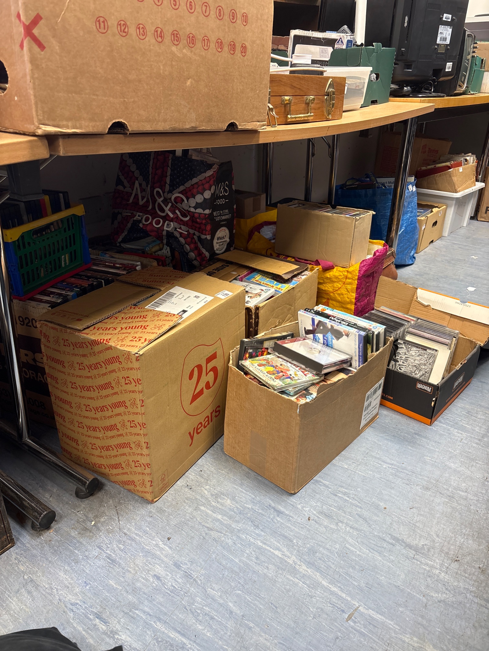 This is a substantial job lot comprising a large quantity of DVDs and CDs. The collection appears to be a mixed assortment of genres, potentially including films, music albums, and possibly other disc-based media. The lot is presented as a bulk offering, ideal for someone looking to expand their media library or for resale.