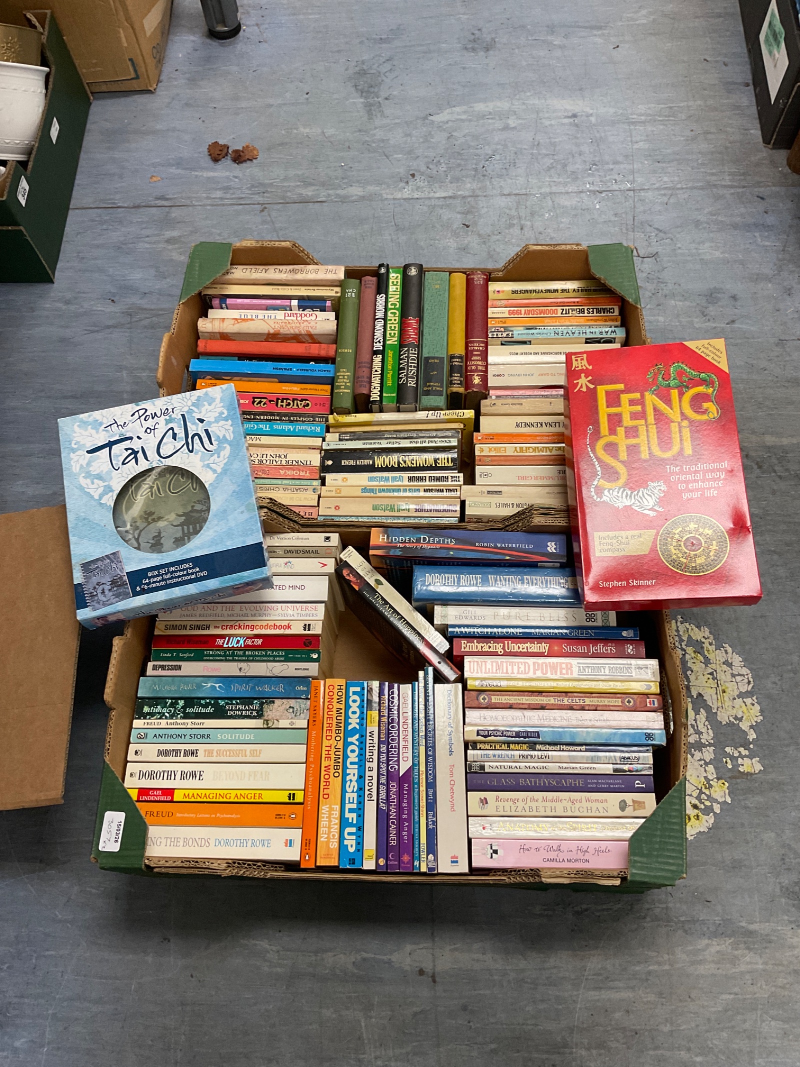This lot comprises two boxes filled with a diverse collection of books focused on Feng Shui and Tai Chi, alongside other related spiritual and wellness topics. The collection appears to span various authors and publications, offering a range of perspectives on these ancient practices. The books cover topics from the practical application of Feng Shui principles to the philosophical underpinnings of Tai Chi, potentially appealing to both beginners and those with existing knowledge.
