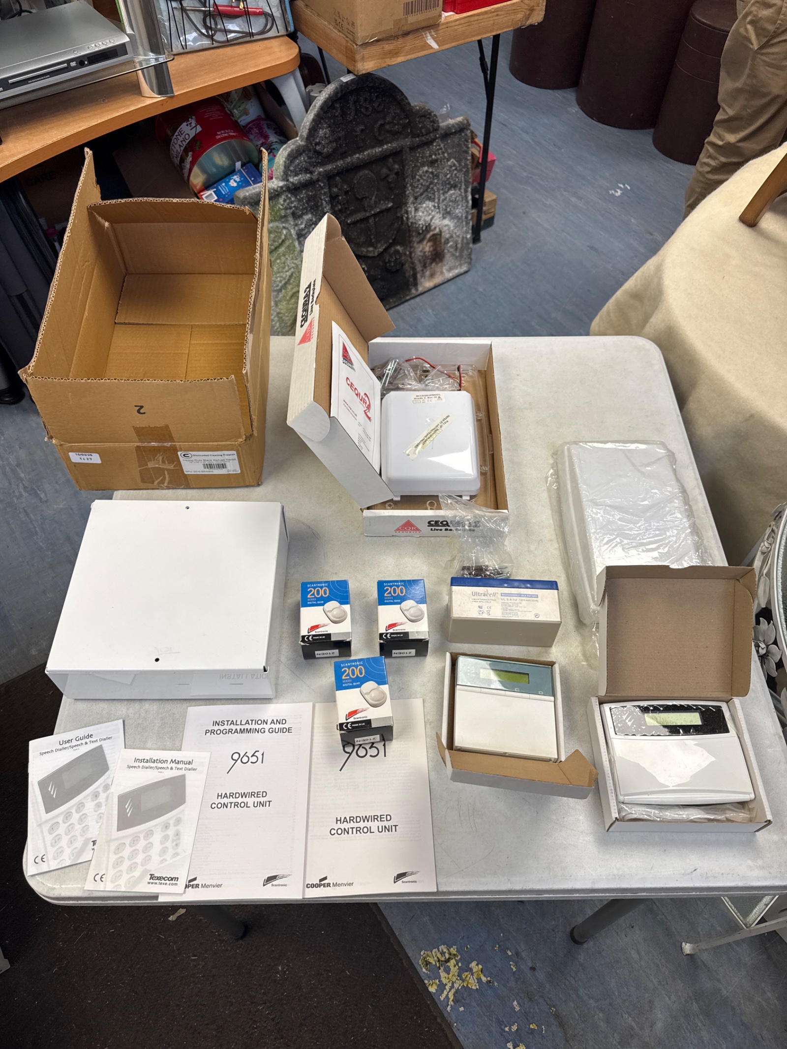 The condition of these components appears varied, with some showing signs of previous use or storage. While the functionality is not assessed, this lot may be of interest to collectors of vintage security systems, hobbyists interested in home automation projects, or those seeking parts for repair or modification of existing systems. The presence of both Scan Vision and CeQura 2 branding adds to the potential collectibility of this lot.