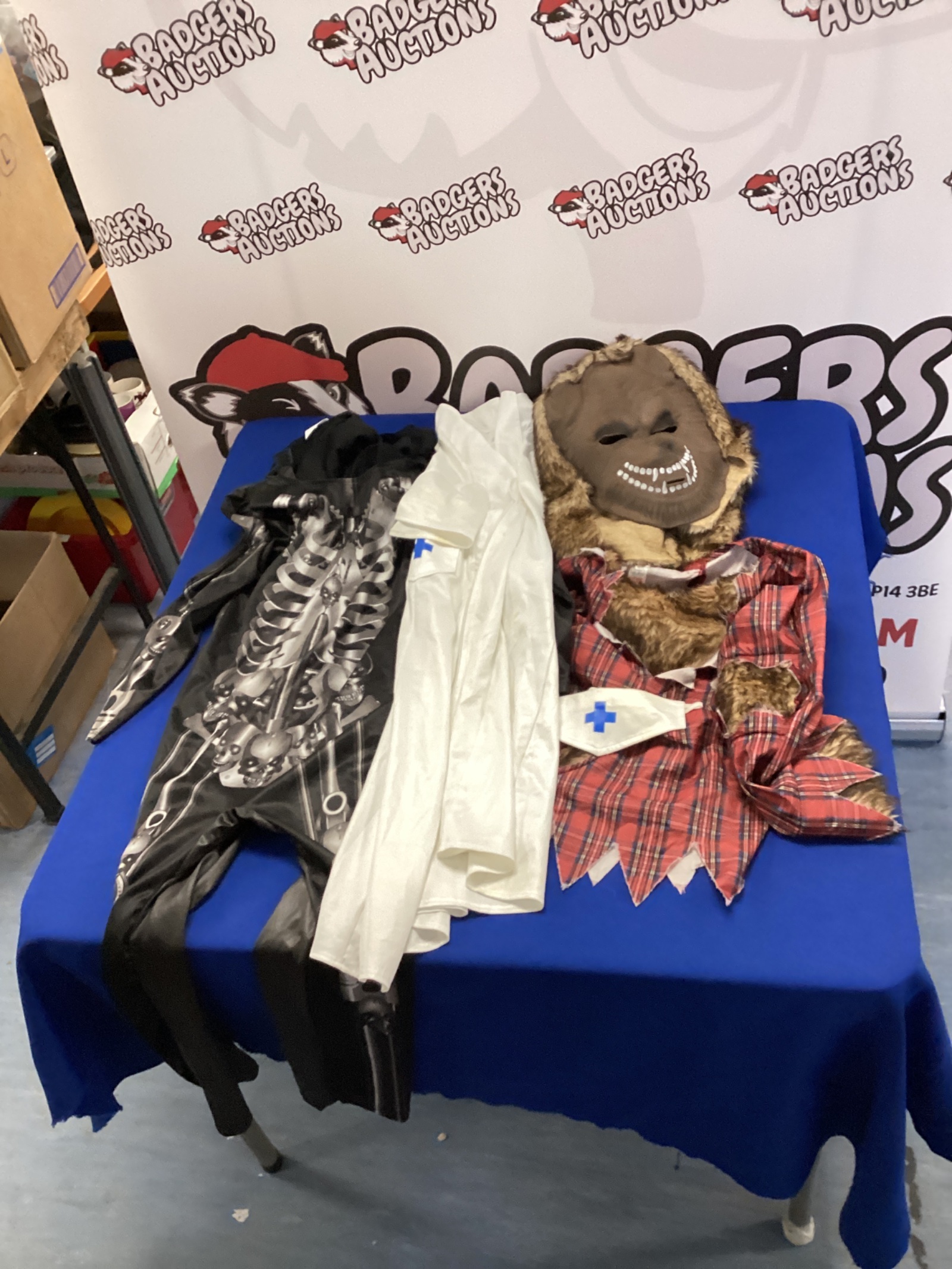 This lot comprises a selection of children’s fancy dress costumes. Included are a nurse’s outfit, a wolfman costume, and a large Batman costume complete with two masks. These costumes are ideal for play, Halloween, or themed parties, offering a variety of characters for imaginative fun.
