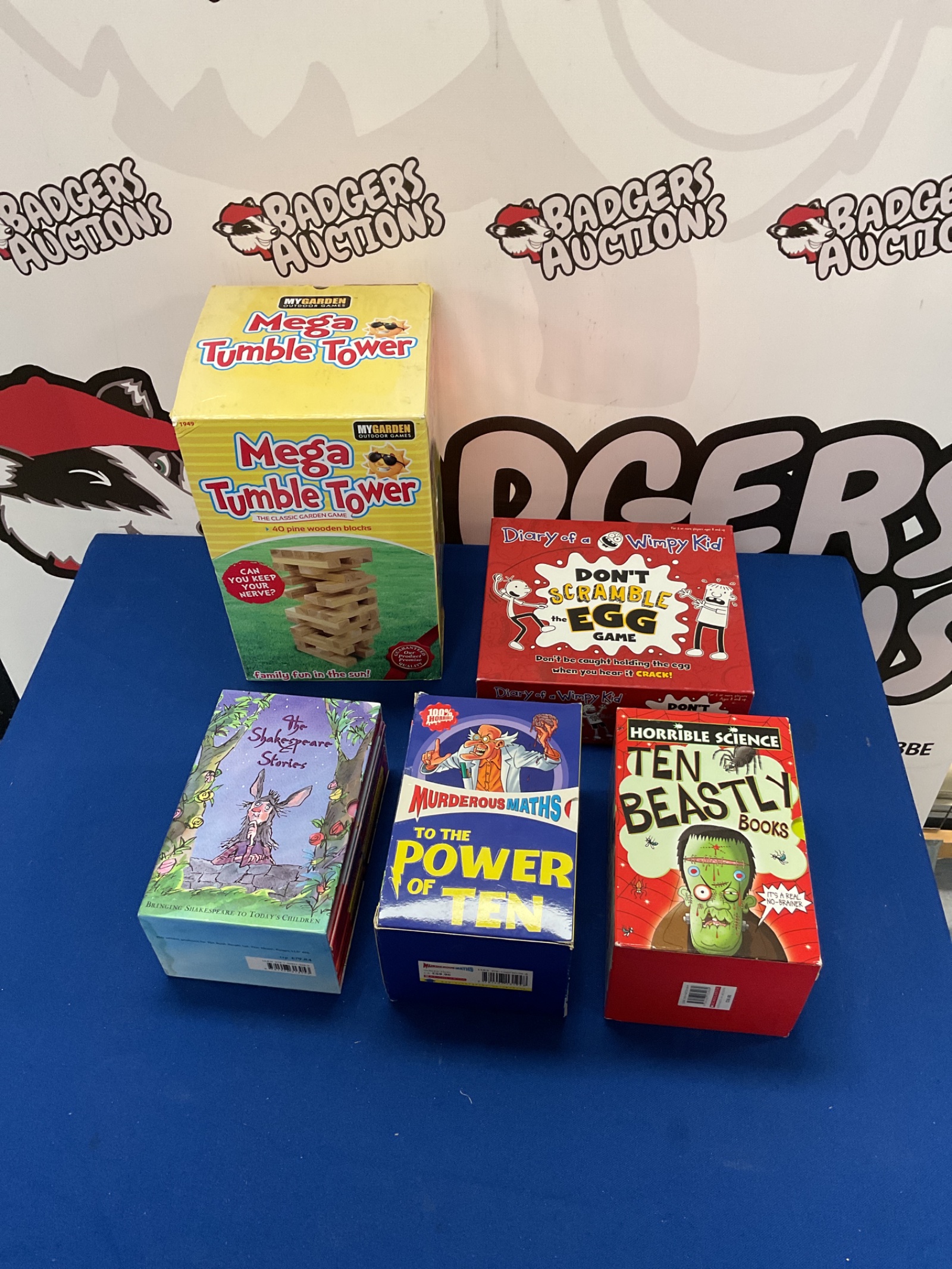 This lot comprises a selection of engaging book sets and a family game. Included are the ‘Horrible Science’ series, offering a quirky approach to scientific learning, ‘Murderous Maths’ which presents mathematical concepts in an intriguing narrative, and ‘Shakespeare Stories’ introducing classic tales. Completing the lot is a ‘Mega Tumble Tower’ game, providing hours of entertainment for all ages, and a ‘Diary of a Wimpy Kid’ game.