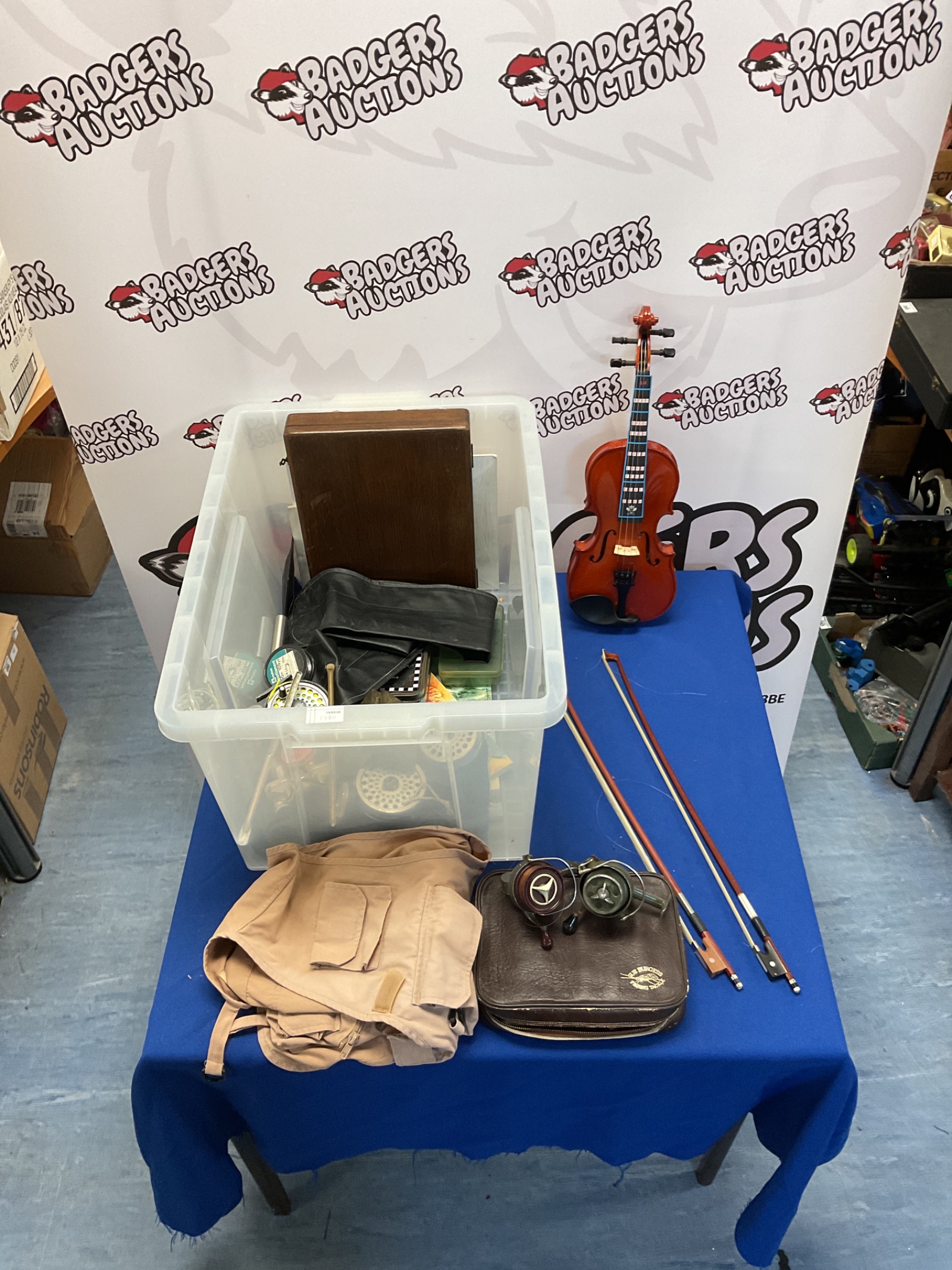 This mixed lot contains a violin with two bows, a fishing tackle bag, fishing wire, and several fishing reels. The violin appears to be a standard student model, constructed from wood with a varnished finish. The tackle bag contains various fishing accessories, including reels and spools of wire, suggesting a collection geared towards freshwater fishing.