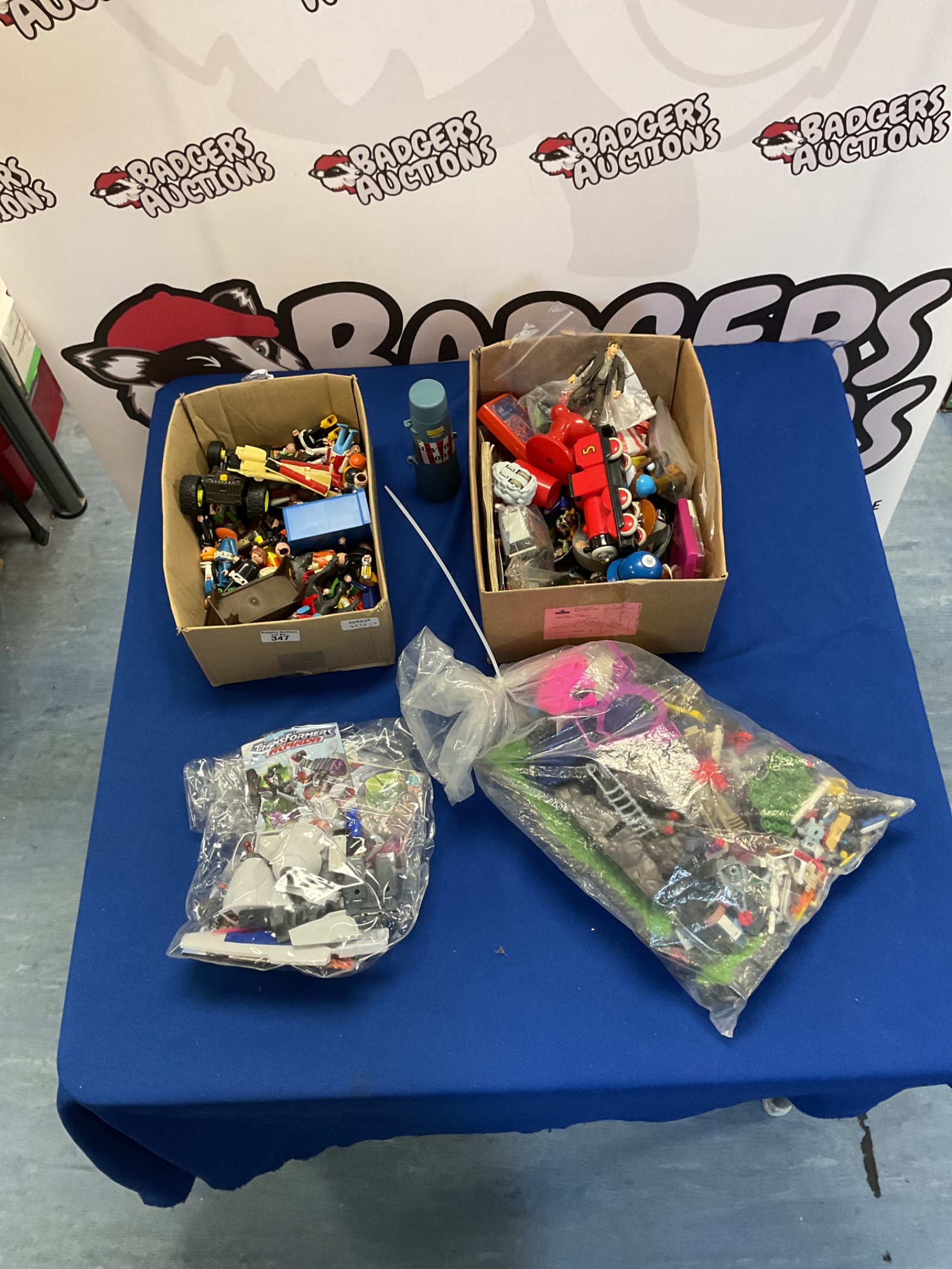 This lot comprises a diverse collection of toys, including a box of Playmobil figures, assorted smaller toys, and a Transformers Armada figure. The Playmobil set appears to feature various characters and accessories, offering potential for imaginative play or display. The inclusion of a Transformers Armada figure adds a collectible element for fans of the franchise.