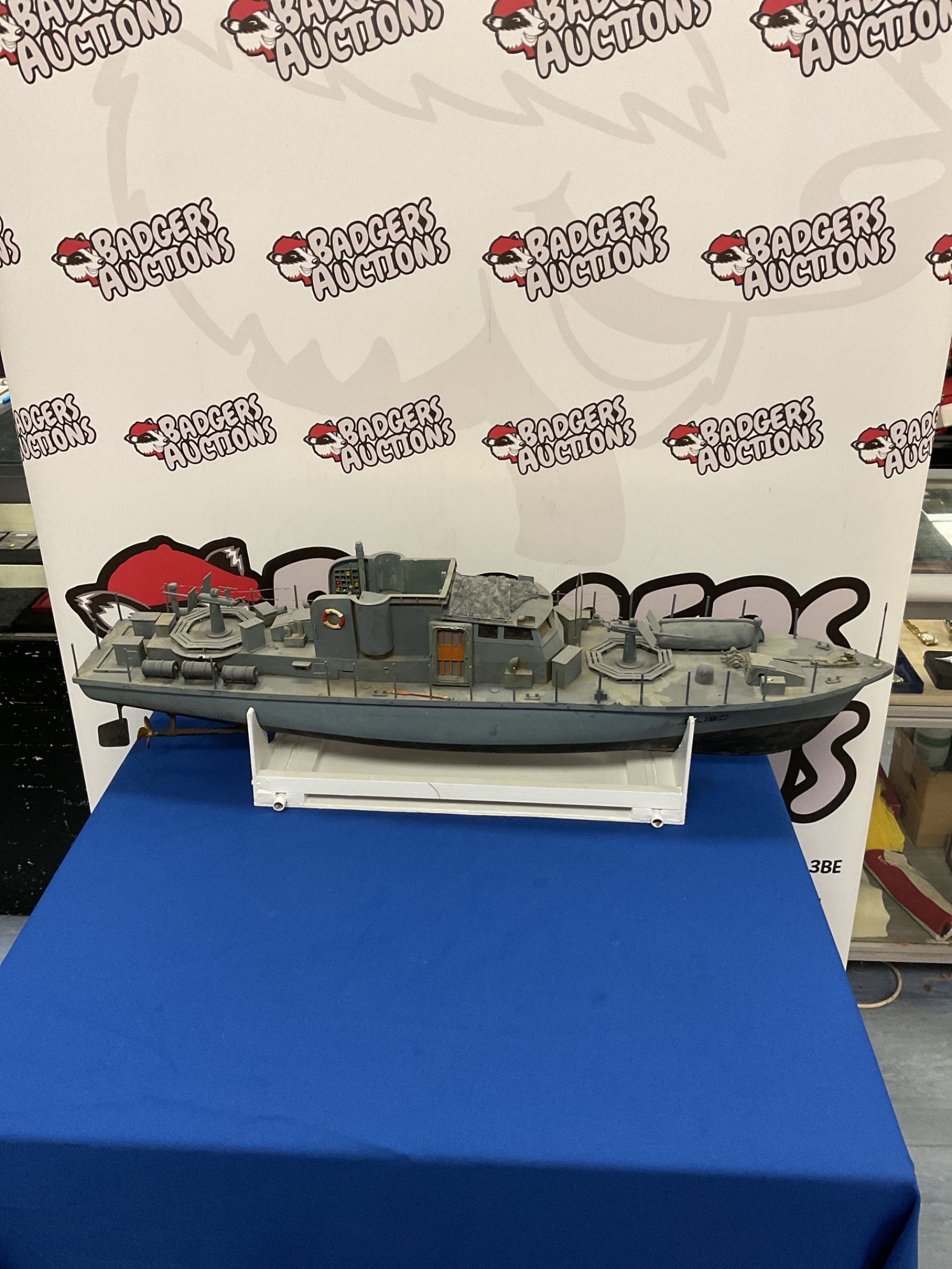 The model battleship presents with signs consistent with age and previous display. There may be minor imperfections or wear to the paintwork and detailing. This model would be of interest to collectors of naval memorabilia, scale models, or those with an interest in military history.