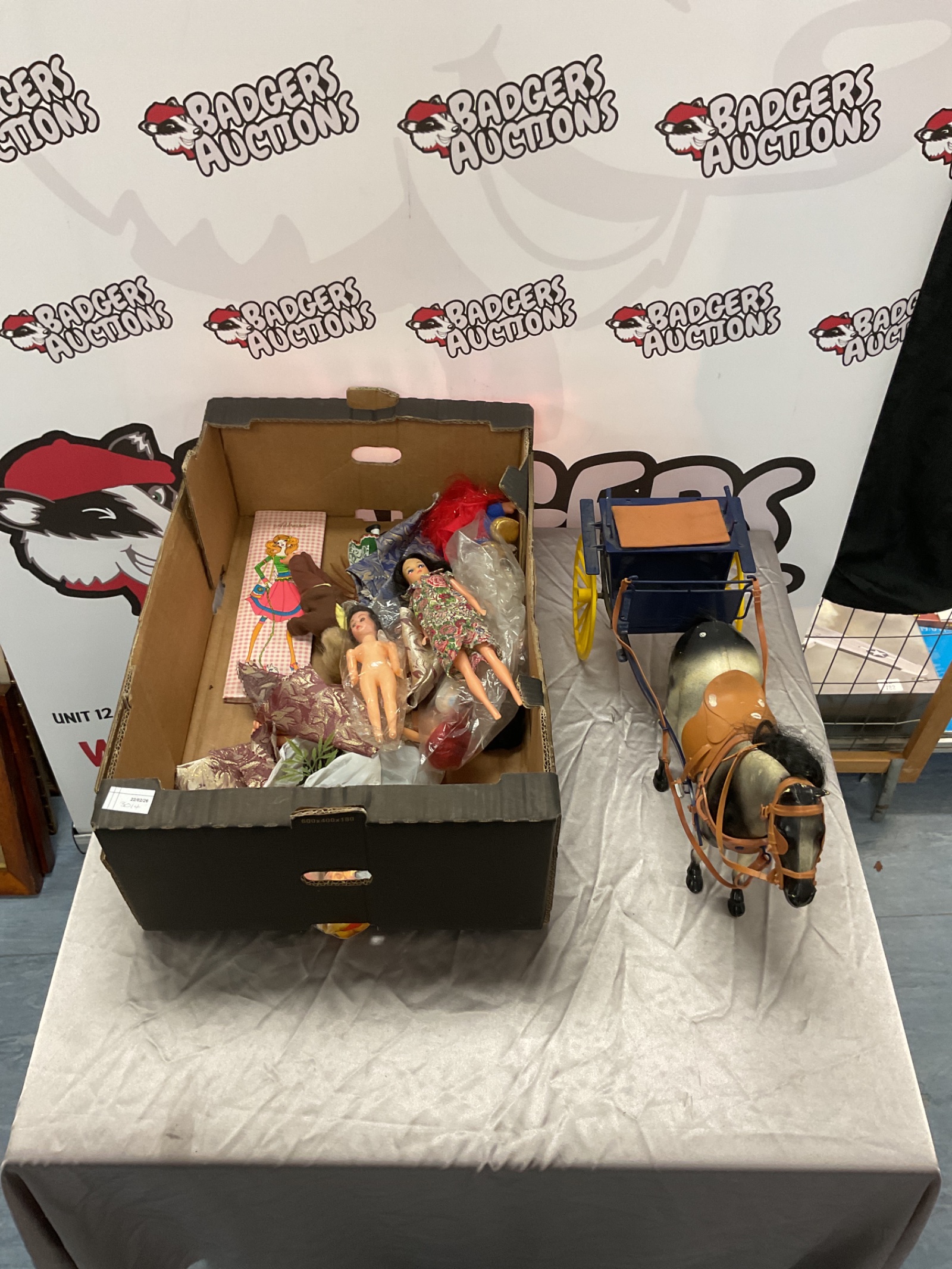 This vintage toy lot includes a model horse and carriage, accompanied by a selection of dolls, including a classic troll doll. The carriage and horse show signs of age and wear, adding to their vintage charm. A delightful collectible for toy enthusiasts and doll collectors alike.