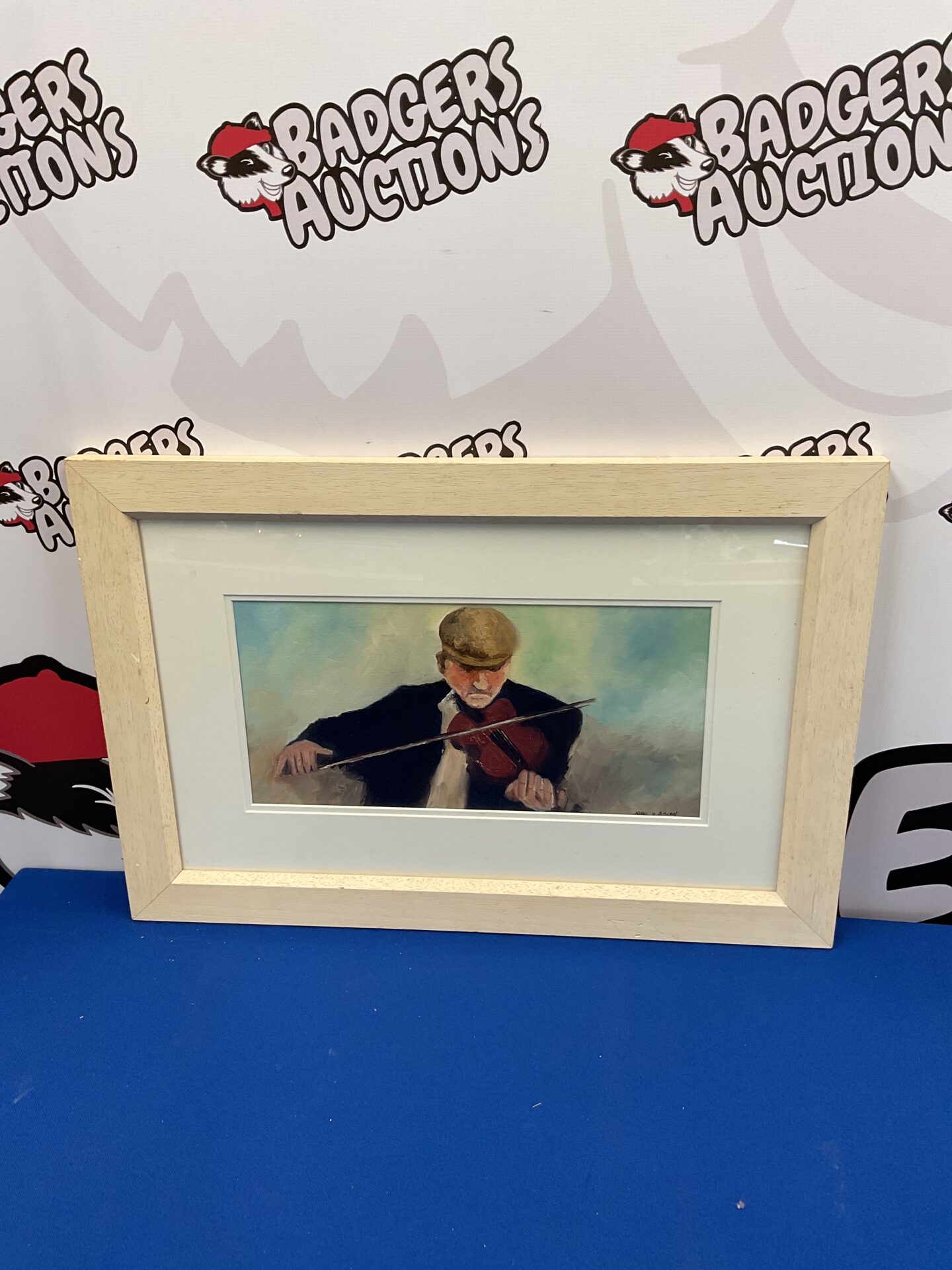 The painting appears to be in good condition, with expected signs of age and wear consistent with a vintage piece. While there may be minor imperfections, these do not detract significantly from the overall aesthetic appeal. This painting would be a valuable addition to any art collection, particularly for those interested in portraiture, musical themes, or the work of Nikki O’Brien. It offers a unique and captivating depiction of a violinist, making it a visually striking and emotionally resonant piece.