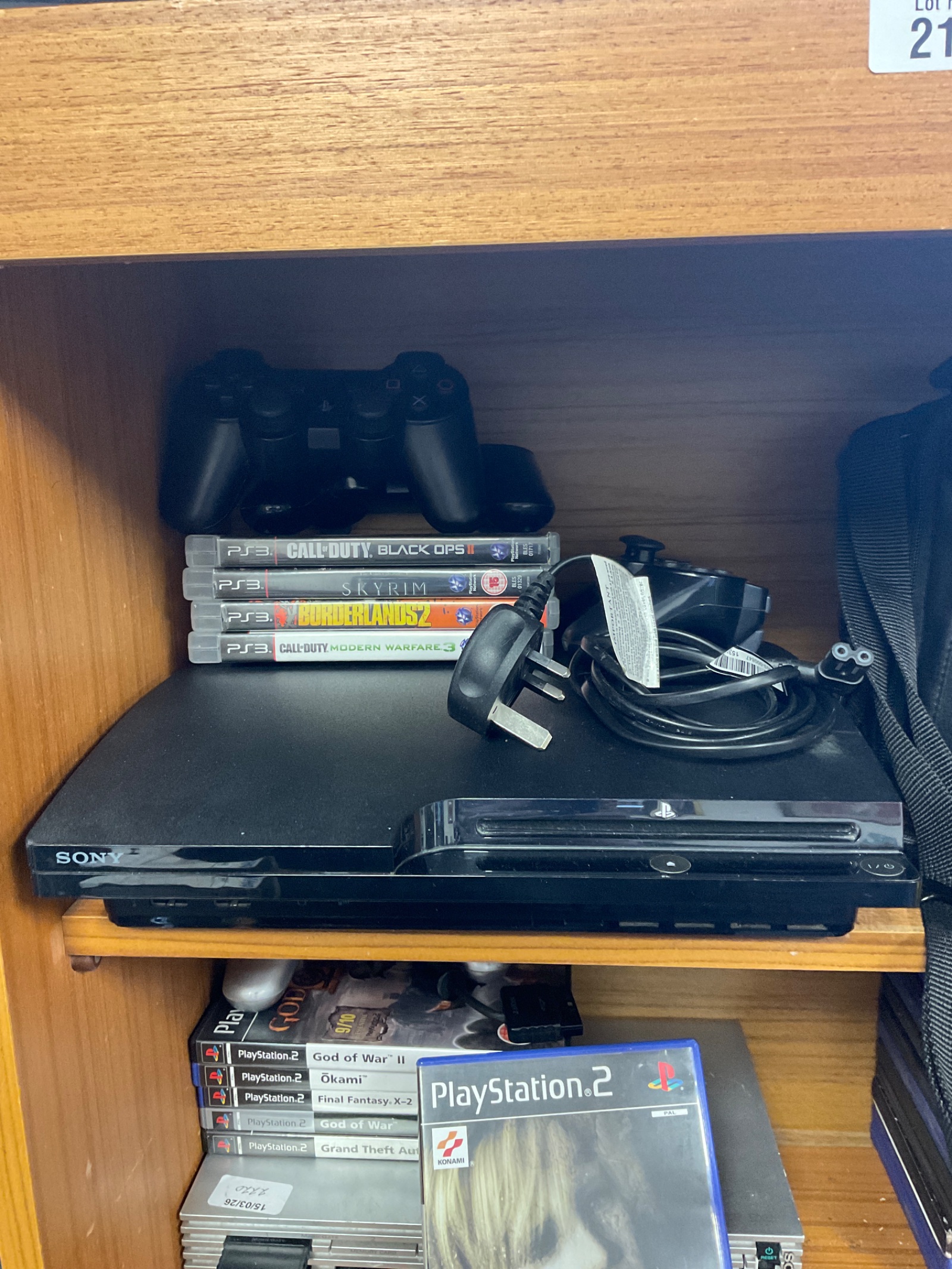 This PlayStation 3 Slim console appears as a used item, and its functionality is not assessed. The console and controllers exhibit signs of wear consistent with use. This lot may appeal to collectors of vintage gaming consoles or those seeking a nostalgic gaming experience.