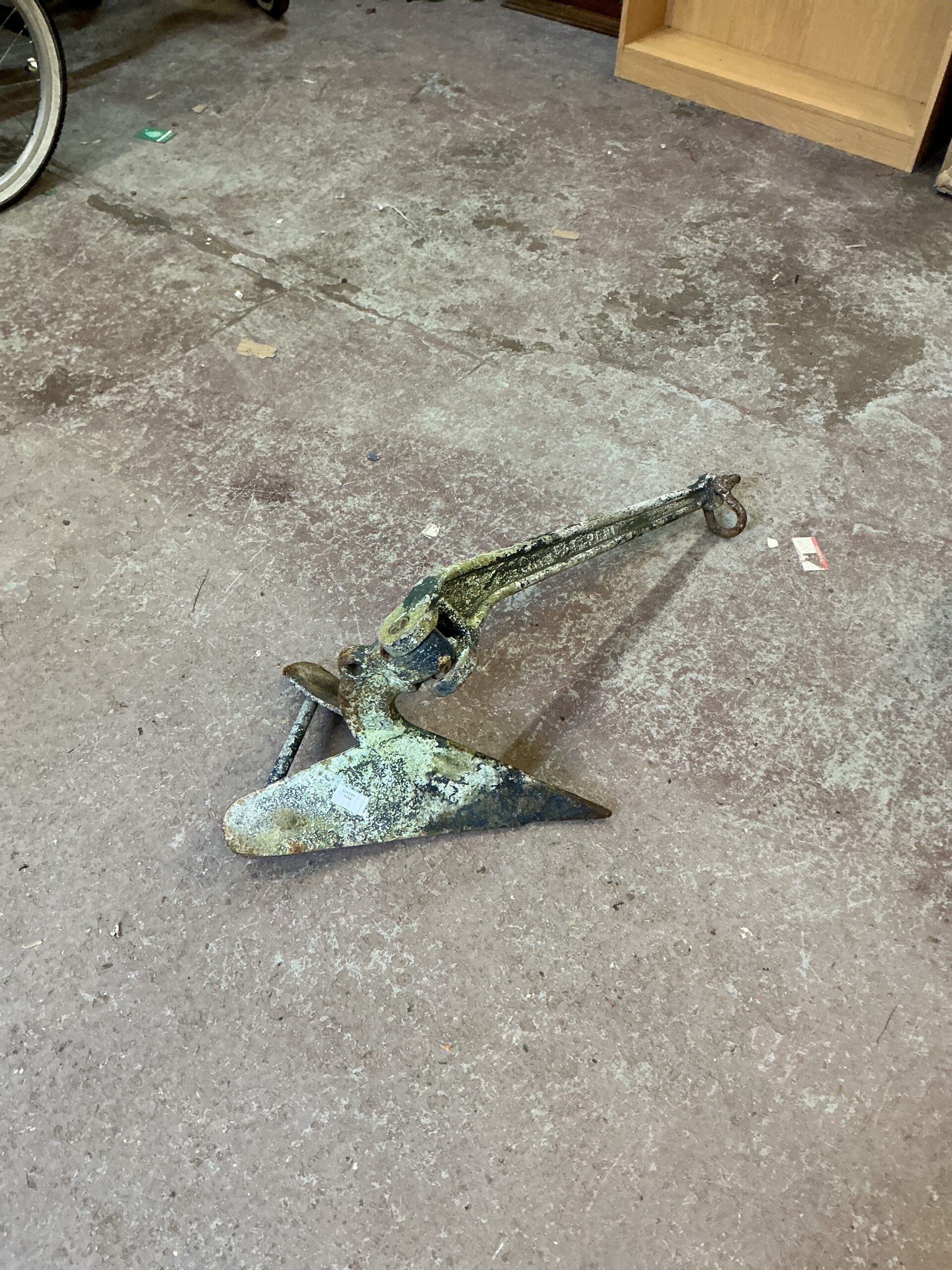 This is a plough drag anchor, designed to dig into the seabed and provide a secure hold for a vessel. Constructed from cast iron, it features a robust plough-shaped design intended to resist being dragged by currents or wind. The anchor’s shape and weight suggest it was intended for use in smaller boats or as a secondary anchor for larger vessels.
