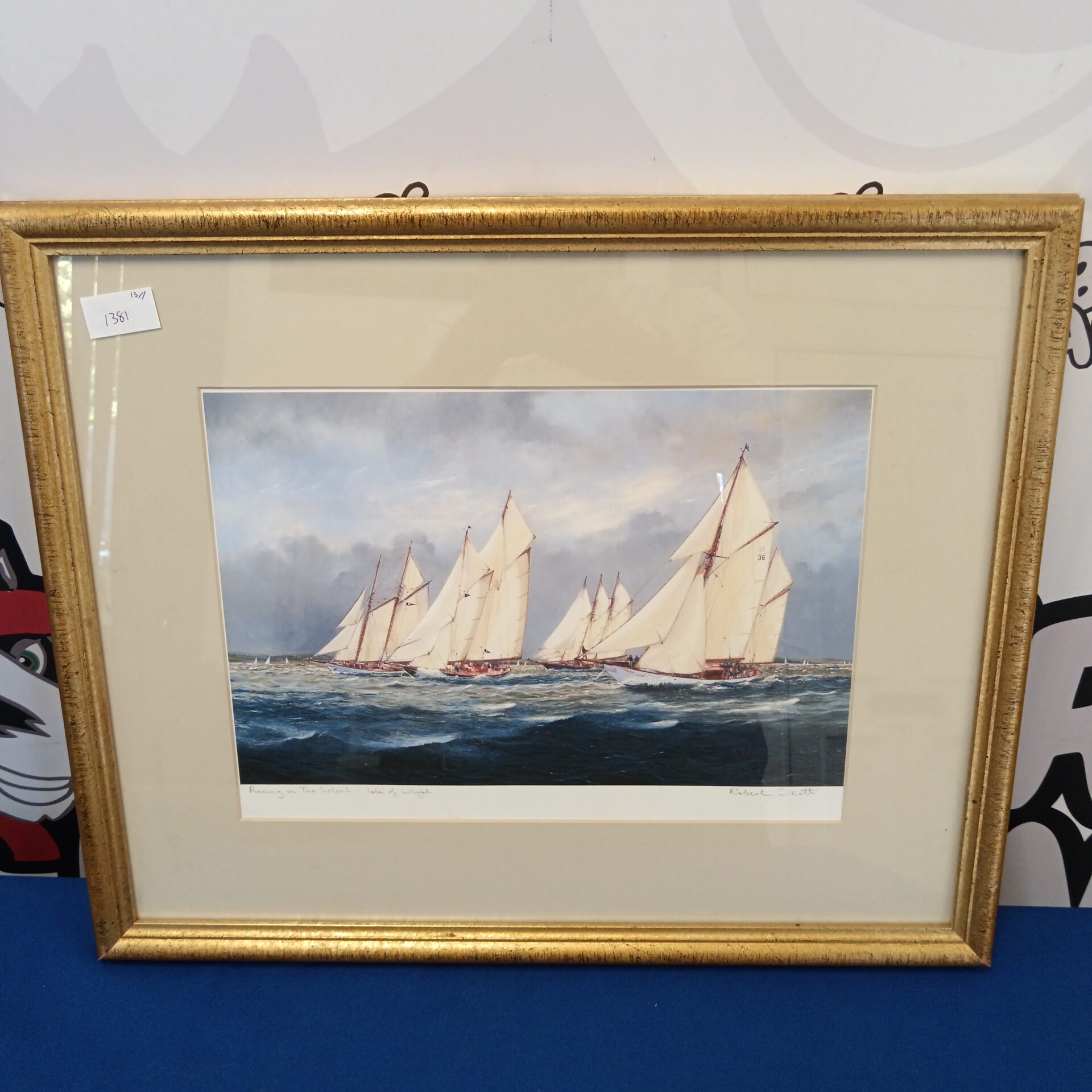 This is a signed print by Robert Scott depicting a vibrant sailing scene in the Solent, Isle of Wight. The artwork captures the energy of a race with several yachts competing, rendered in a classic style with attention to detail in the depiction of the boats and the water. The print is a beautiful example of maritime art, showcasing Scott’s skill in capturing the atmosphere of a coastal race.