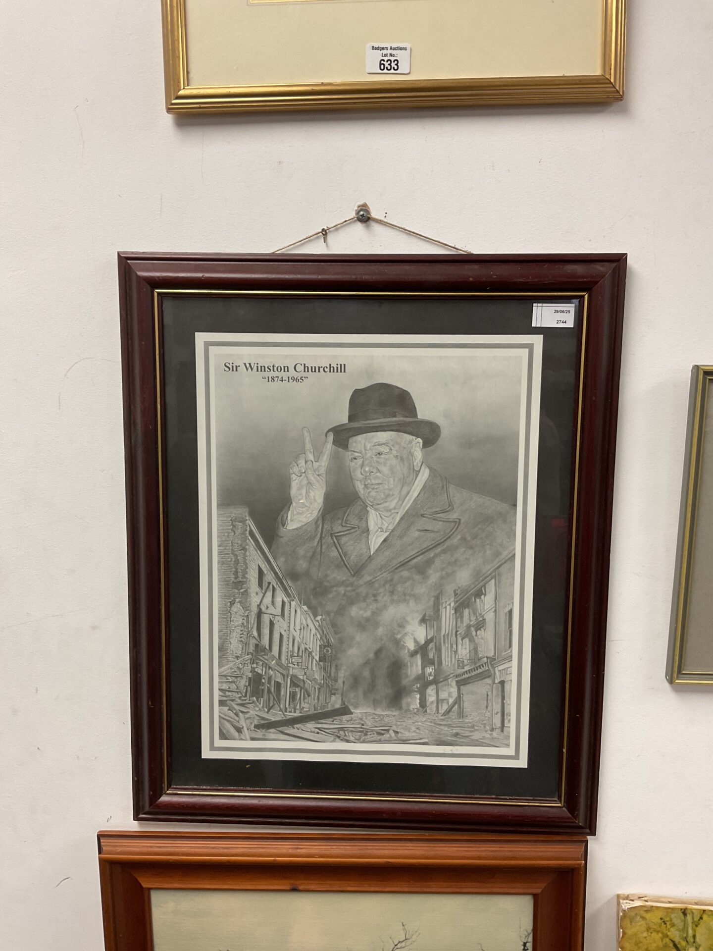 This is a framed print depicting Sir Winston Churchill (1874-1965). The print showcases a portrait of the iconic British statesman, known for his leadership during World War II. The print is presented within a wooden frame, enhancing its display potential and offering a classic aesthetic.