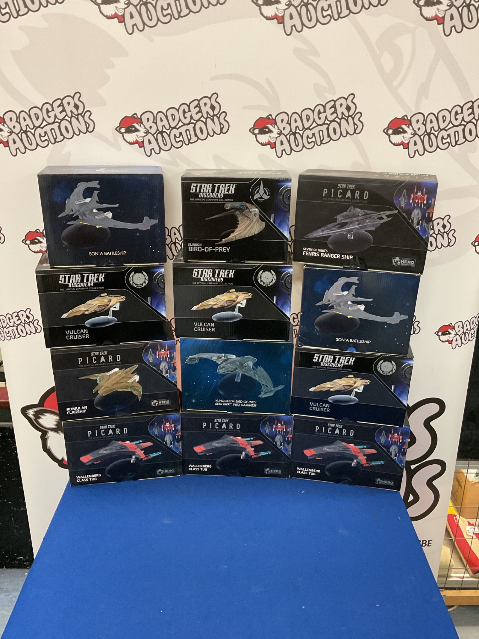 These starships present as previously displayed, and their condition should be assessed from the provided images. This collection will appeal to dedicated Star Trek fans and collectors of sci-fi memorabilia, offering a chance to own a piece of the Star Trek universe. The variety of ships included makes this lot a desirable addition to any collection.