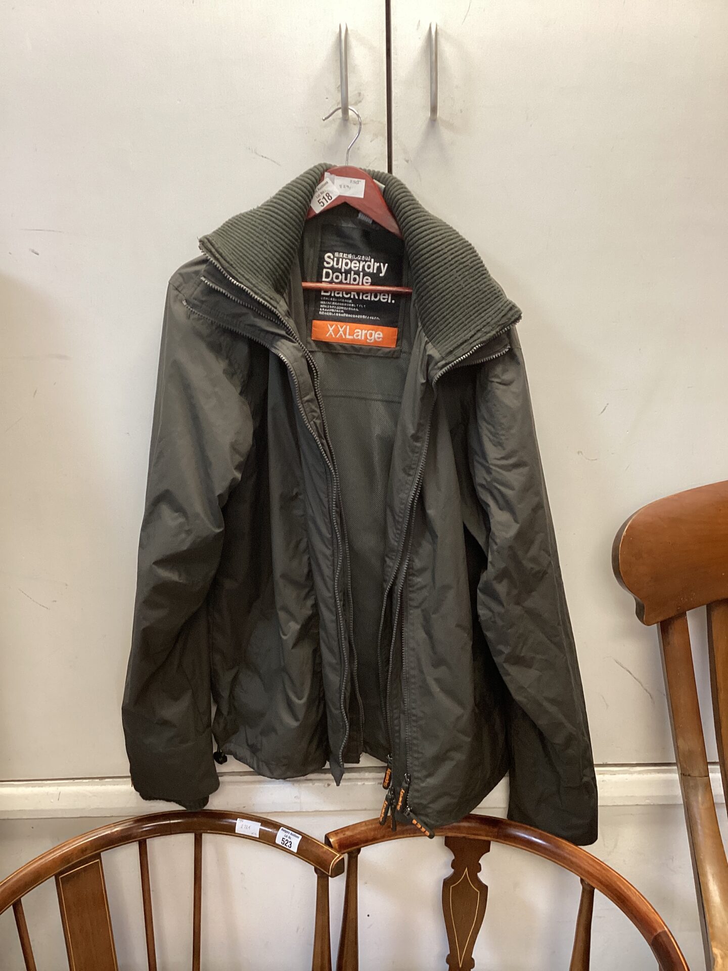 This is a Superdry Double Black Label jacket in size XXL. The jacket features a classic bomber style with a ribbed collar, cuffs, and hem. It has a zip-up front, multiple pockets, and the signature Superdry branding. The jacket is designed for both style and practicality, offering a comfortable fit and durable construction.