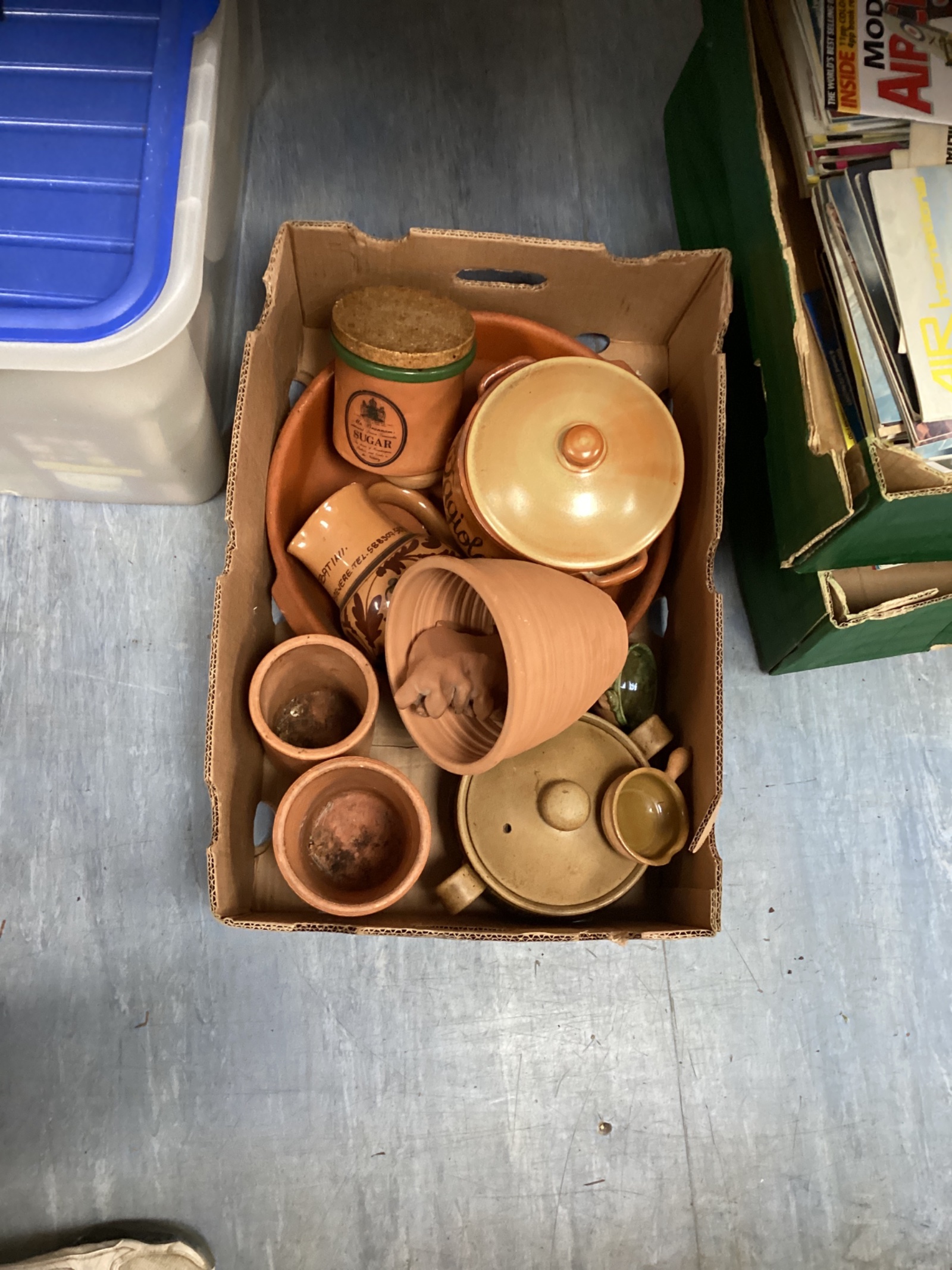 This collection features a variety of terracotta pottery pieces, including what appears to be a sugar container with a cork lid, a small bowl, and a larger, shallow dish. The pieces exhibit a rustic, hand-crafted aesthetic, suggesting they were likely made for practical use in a kitchen or garden setting. The earthy tones and simple designs contribute to a charming, vintage feel.