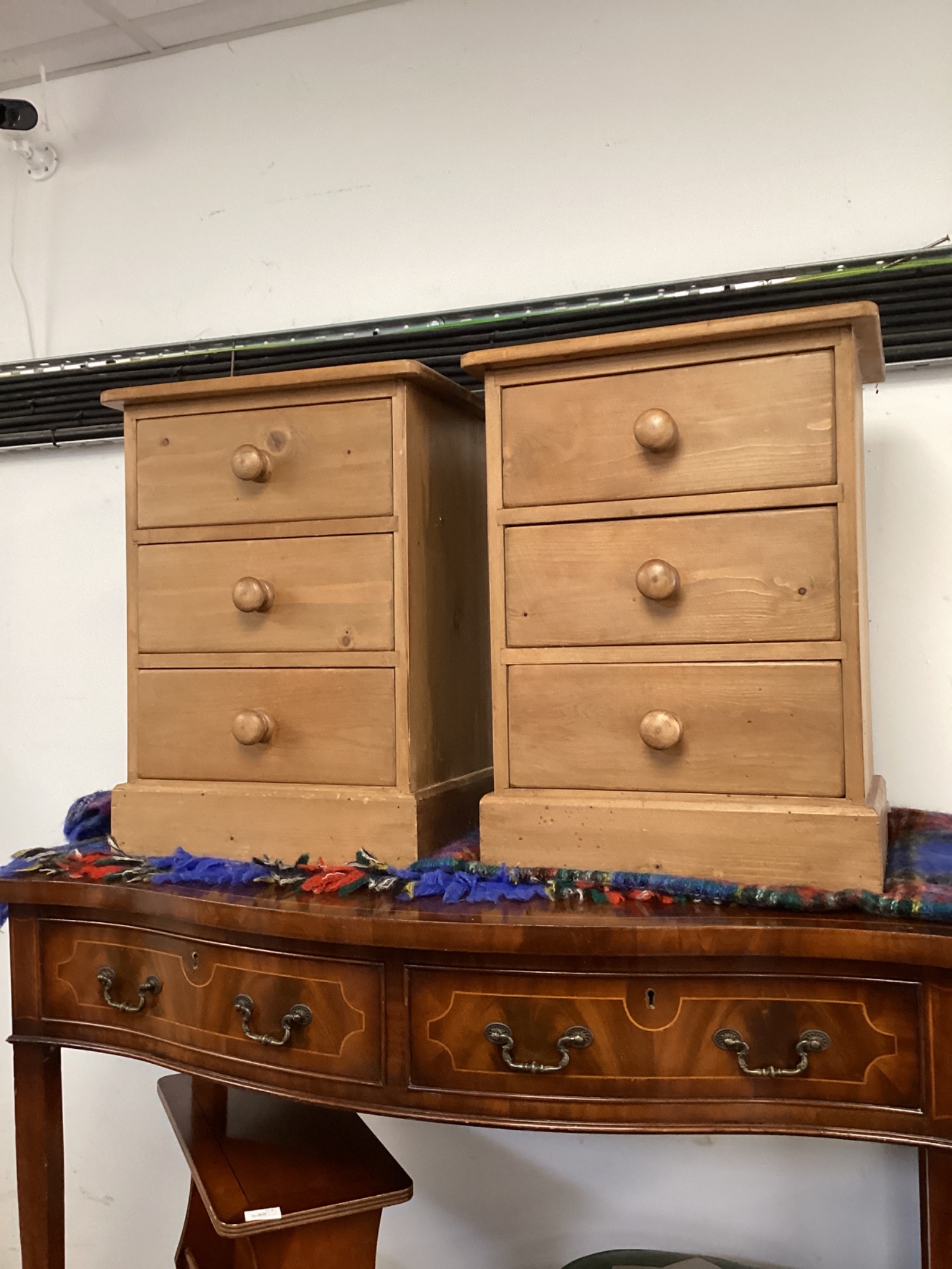 These are a pair of vintage pine bedside cabinets, exhibiting a simple, rustic charm. Constructed from solid pine, they feature a rectangular form with a single drawer and open shelving below. The warm tone of the wood and the clean lines suggest a country or cottage style aesthetic, ideal for adding a touch of vintage warmth to a bedroom.
