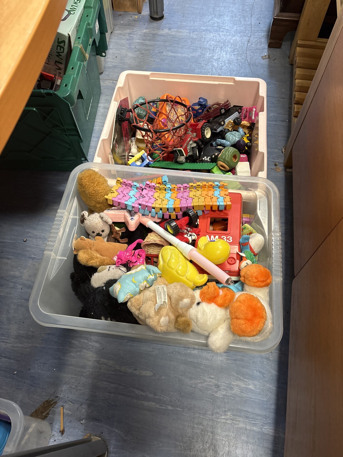 This lot comprises a diverse collection of vintage and retro toys, presented within two storage boxes. The assortment appears to include diecast vehicles, plastic figures, and various smaller playthings spanning several decades. The toys exhibit a range of styles and scales, suggesting a compilation gathered over time, offering a nostalgic glimpse into playthings of yesteryear.
