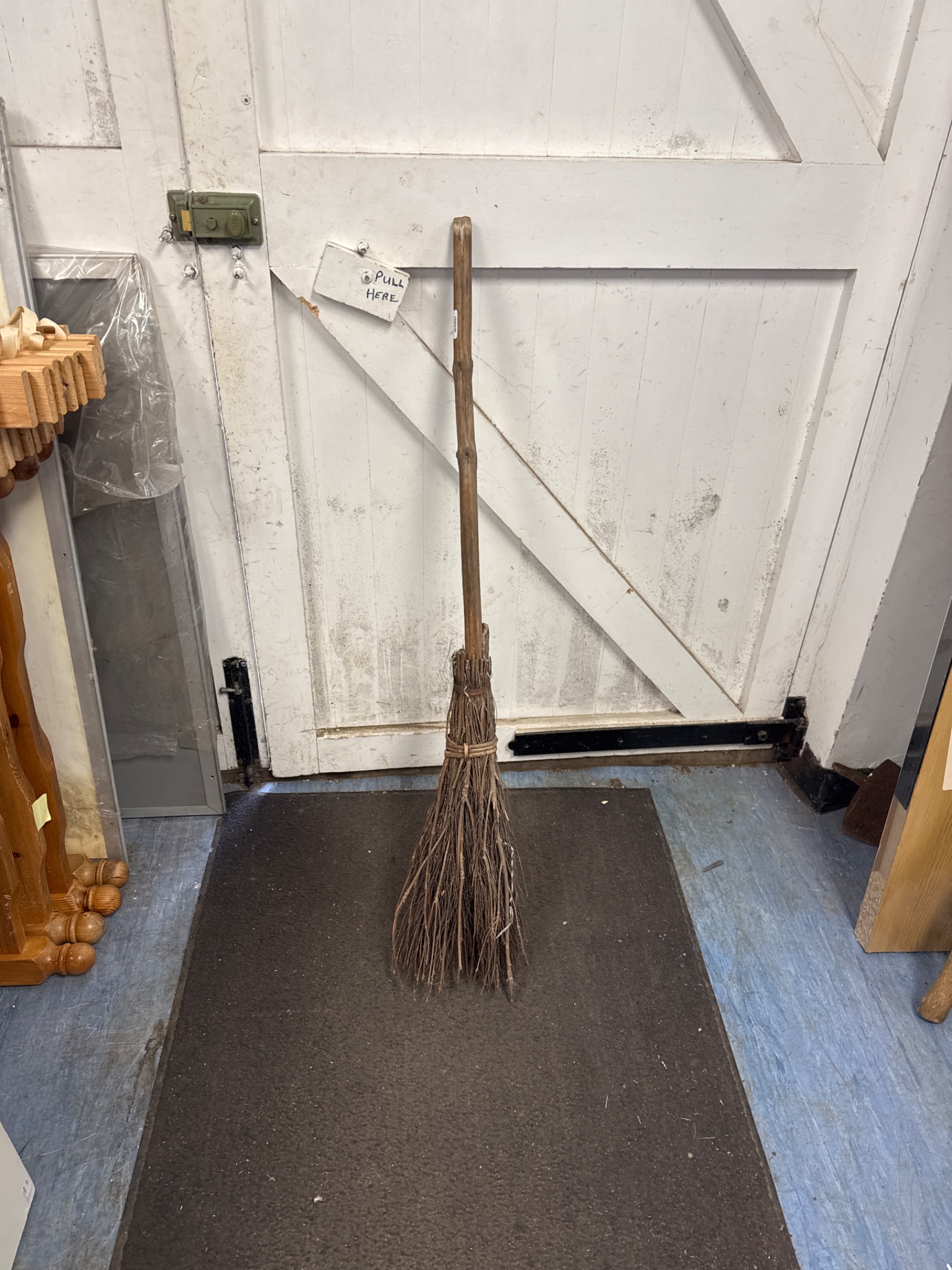 The broom displays signs of age and use, with some wear to the bristles and a weathered appearance to the handle. While not in pristine condition, this adds to its character and authenticity as a vintage item. Collectors and those seeking unique decorative pieces will appreciate its aged charm and potential as a statement piece for Halloween or a rustic-themed display.